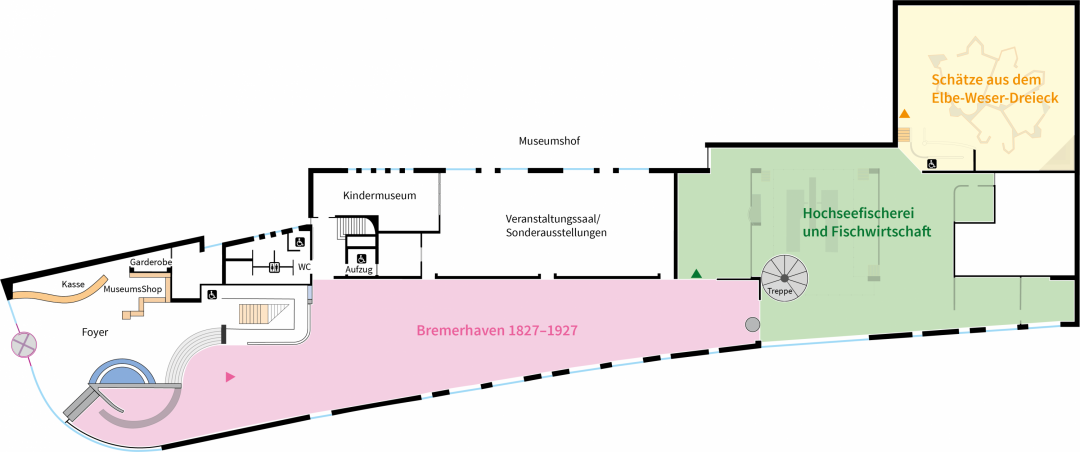 Zeittypisch sowie vorbildhaft ist ferner die Mischung zwischen skulpturaler Strenge und spielerischen Details. So beleben „Wasserwesen“ bildhauerisch den Innenhof und ein silberner Aufsatz krönt den Handlauf zum Vorplatz auf dem wiederum eine, der Geeste gleich geschlängelte, Sitzbank zwischen Betonreliefs der Orte Lehe, Geestendorf und Bremerhaven bereits in die lokale Geschichte einführt.